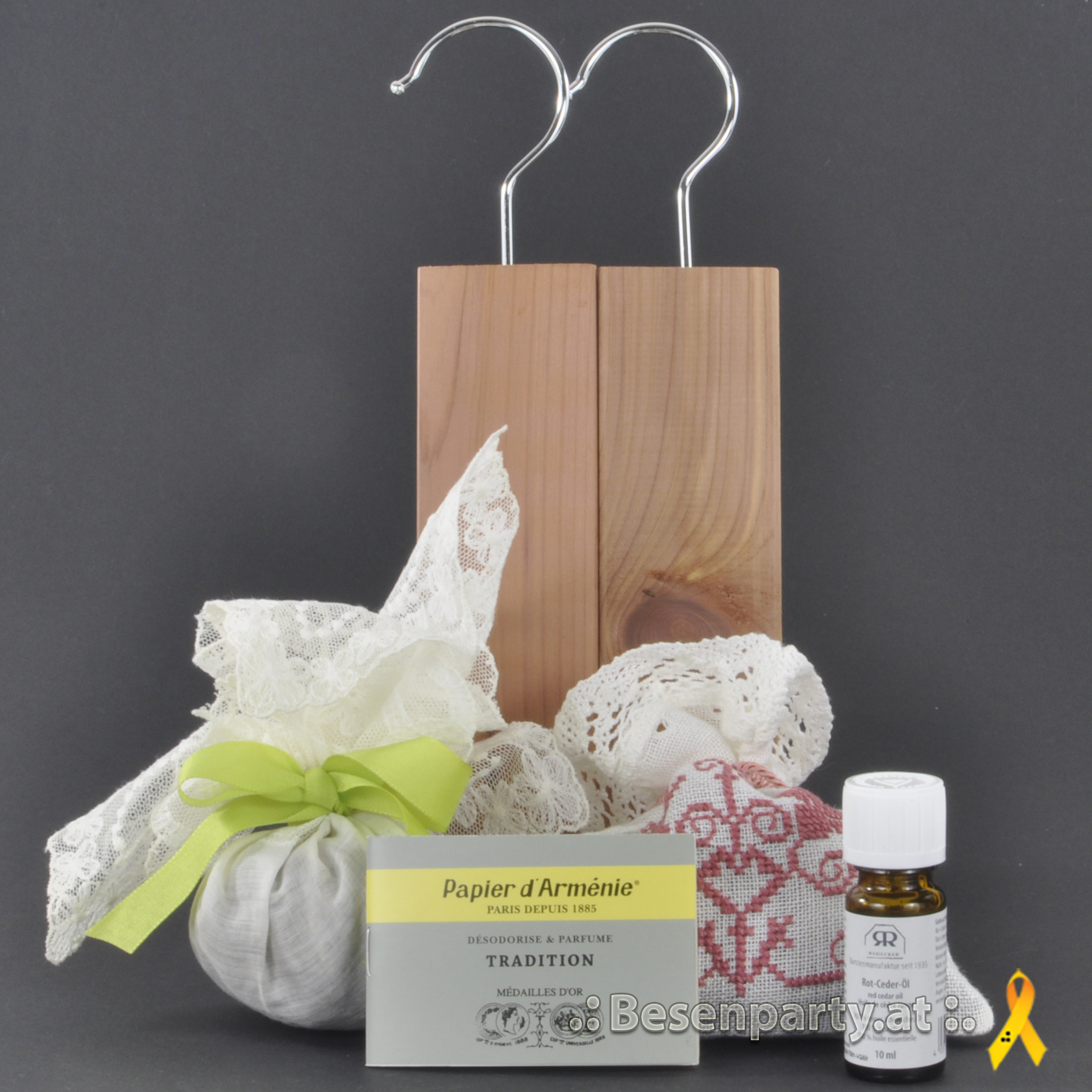 Alles duftet! – im Kasten, im Wäscheschrank und im Wohnzimmer. Papier d’Armenie kommt aus Frankreich und beinhaltet 36 Streifen, einfach einen Streifen wie eine Ziehharmonika zusammenfalten, anzünden und wieder ausblasen, die Glut geht weiter und erfüllt Ihren Raum mit aromatischen Duft. Der heurige Lavendel duftet nach Sommer und ist in hübschen, bestickten Taschentüchern eingepackt und die Motten mögen diesen Duft überhaupt nicht. Ebenso den Duft von Zedern, den die zwei Häken ausströmen, auch ein Zedernholzöl ist dabei, damit Sie den Duft von den Haken immer wieder auffrischen können.
