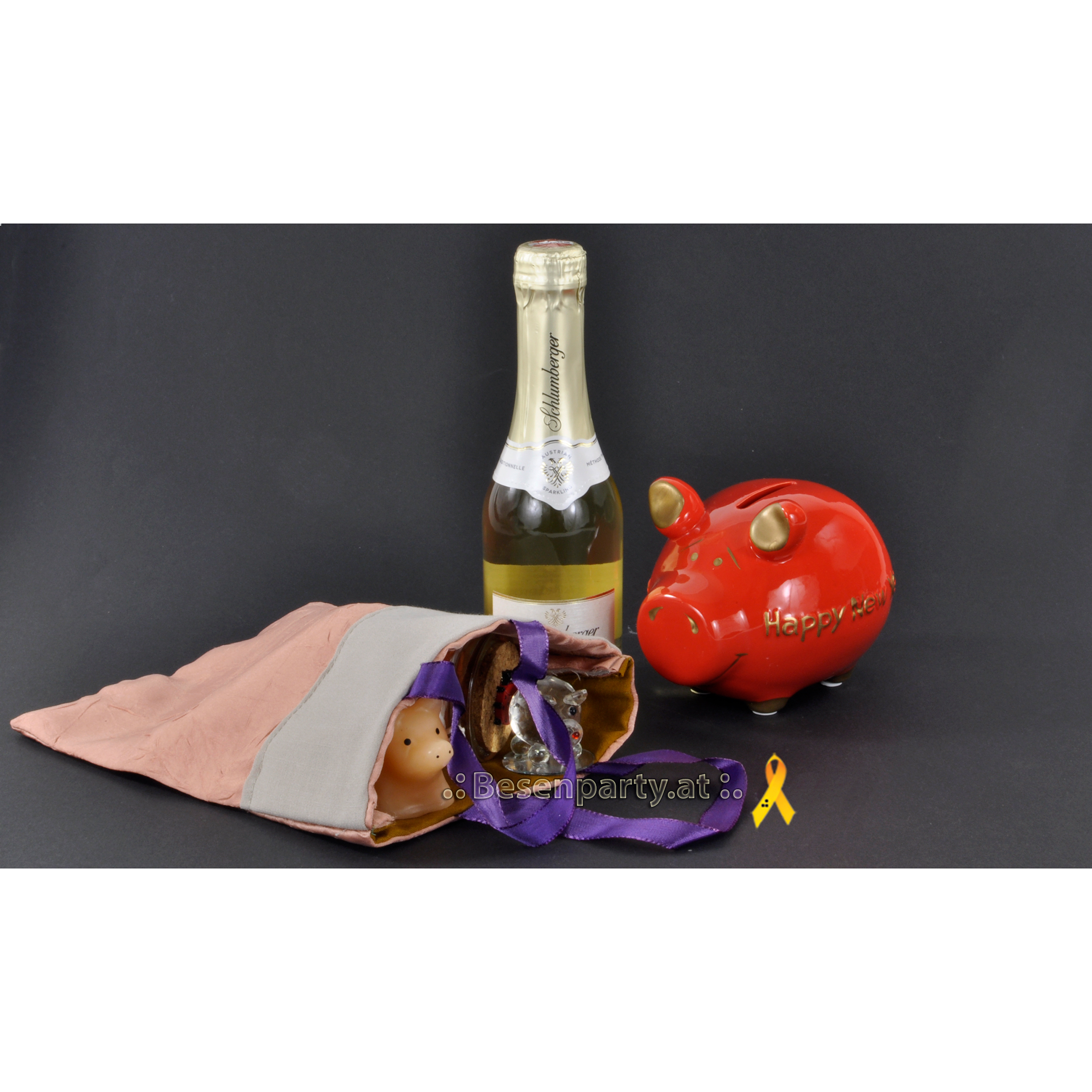 Zack – und das Jahr ist um! Bald feiern wir wieder Silvester und feiern das Neue Jahr. Man sollte sich aber auch für das alte Jahr bedanken, dass man es über die Bühne gebracht hat. Der eine mehr, der andere weniger gut, aber wir haben es geschafft. Feiern oder gemütliches Zusammensein, Glücksbringer, ein Schweinderl fürs besondere Glück und ein Schlumberger Piccolo gehören dazu. Das Ganze ist eine handgenähte Tasche verpackt, die man im Badezimmer für Utensilien verwenden kann.